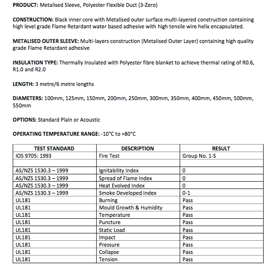 All ducting meets AS 4254 Standard and AS 1530 Part 3 Fire Test